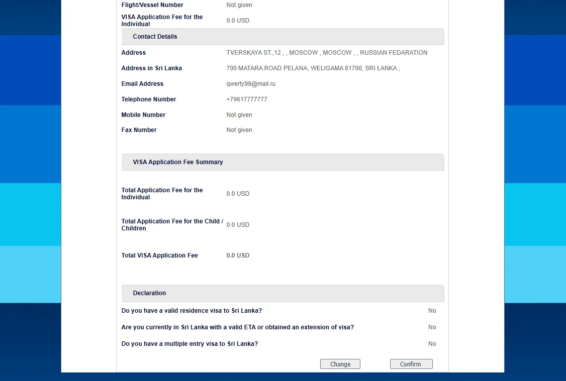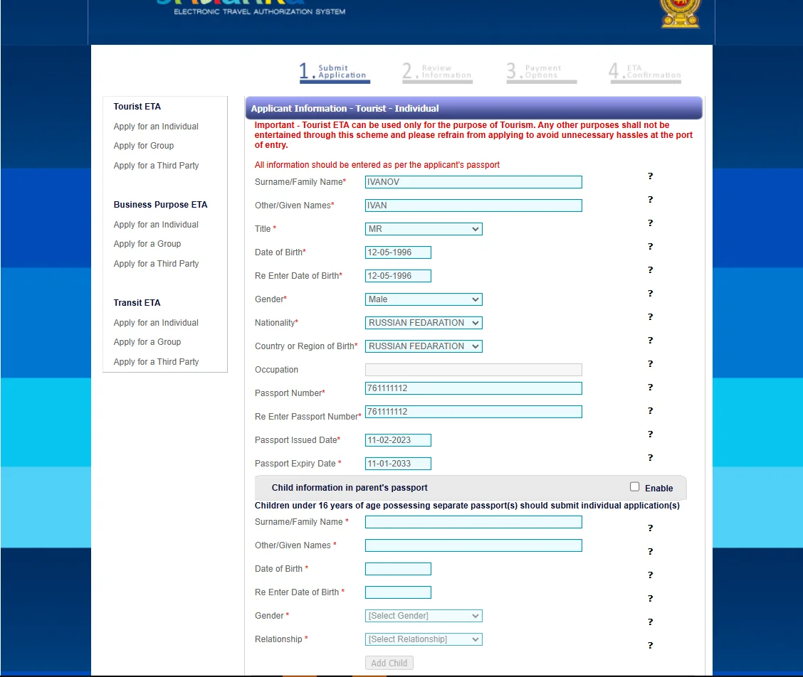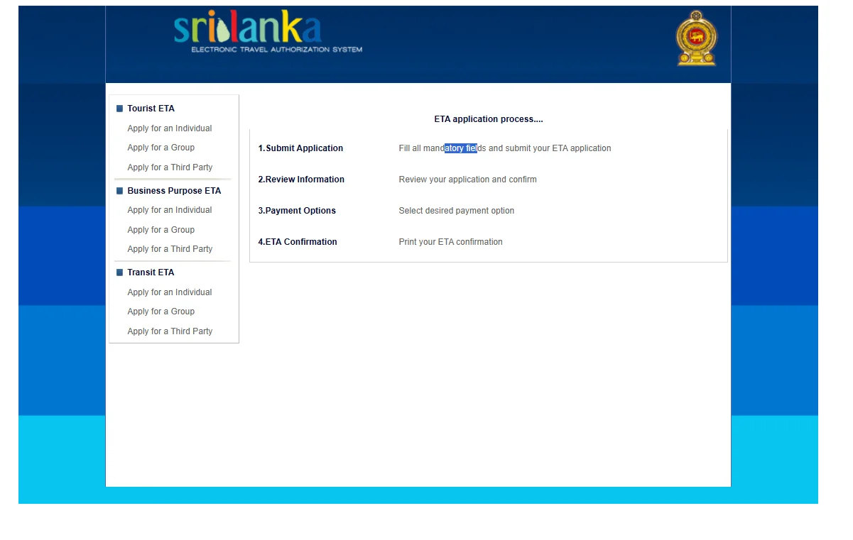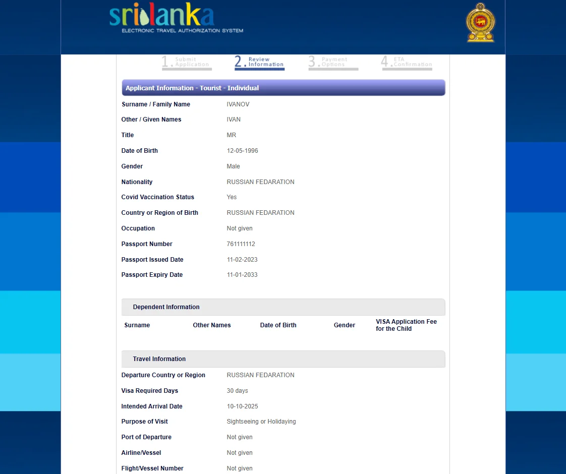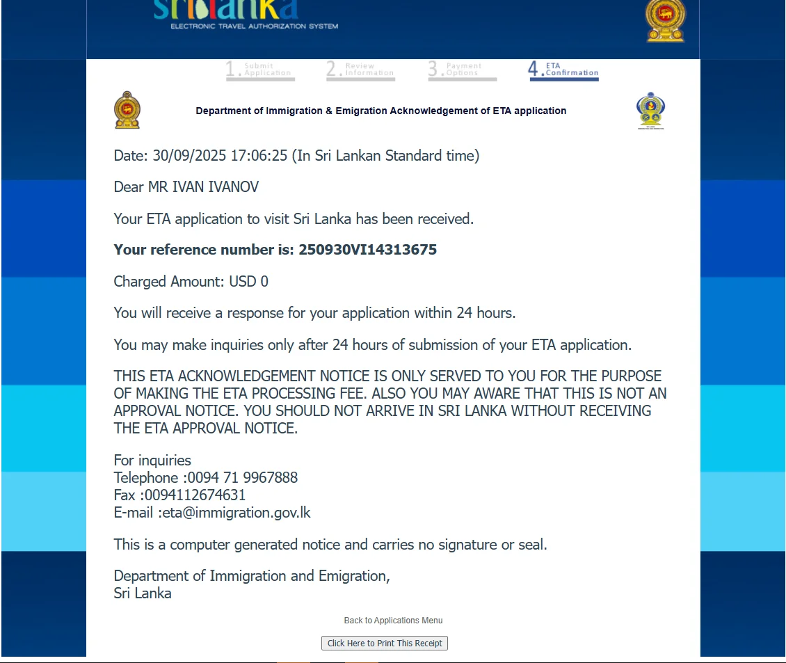 Необходимо зайти на сайт https://eta.gov.lk заполнить все пункты анкеты, загрузить необходимые документы, произвести оплату за визу и сервисный сбор. Стоимость электронной визы 50 $ за человека + банковский сбор. Далее на вашу электронную почту придет подтверждение ETA. Его нужно распечатать и взять с собой. Рекомендуется оформлять ЕТА заранее — за 5 рабочих дней до вылета.